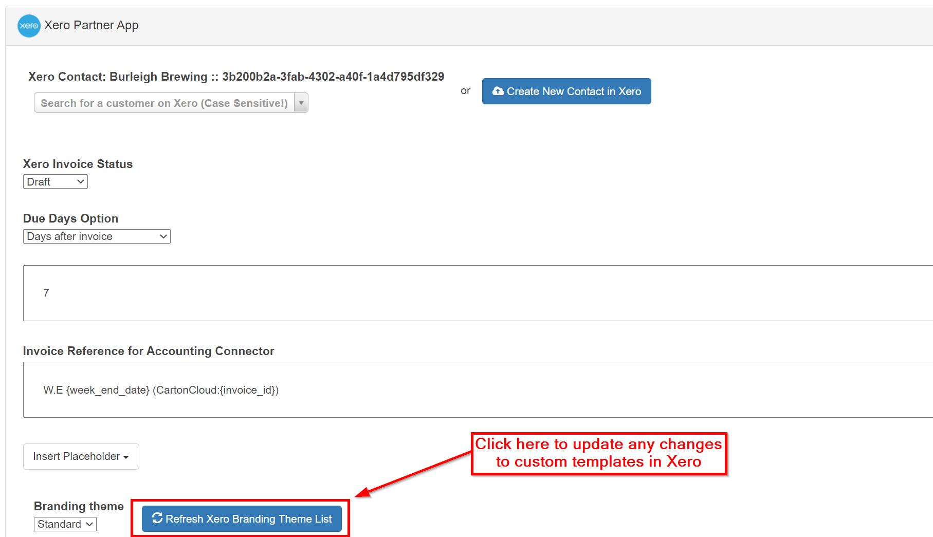 When making changes to this template in Xero, you will need to update your Customer Settings in CartonCloud. Using the Refresh Xero Branding Theme List from the Accounting Connector page in the Customer Settings, you can do this.