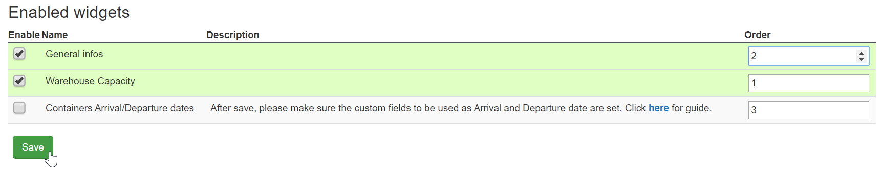 By default, all widgets will be enabled. To disable a widget, untick the select box.