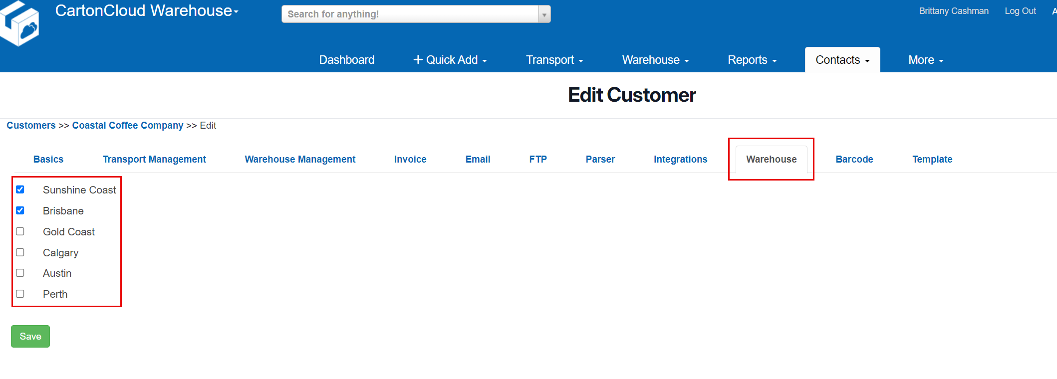 Use the select box against the Warehouse Name to select which warehouse the Customer has access to.