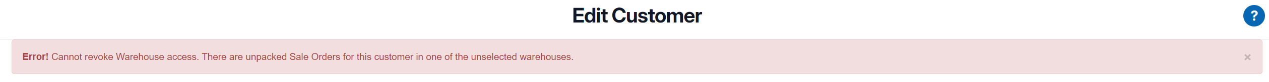 Note, if you are removing Customer's access from a warehouse and there are unpacked Sale Orders in that warehouse for the Customer you will be prompted with an error message: Error! Cannot revoke Warehouse access. There are unpacked Sale Orders for this customer in one of the unselected warehouses. To resolve this error you will need to dispatch the Sale Orders from the warehouse before removing the access.