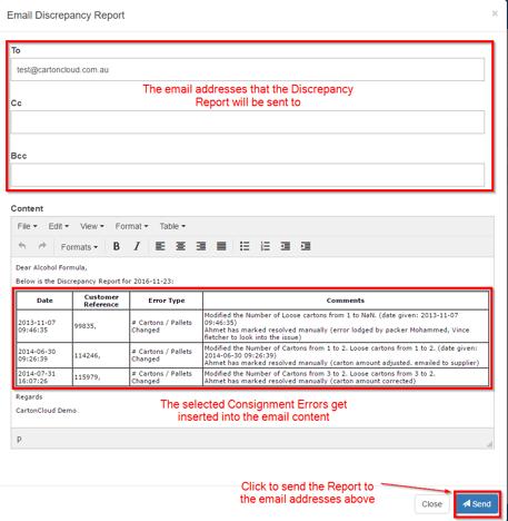 1. Click on the Send Email button and a popup will appear containing the formatted Default Email Content as well as the email addresses the Discrepancy Report will be sent to.