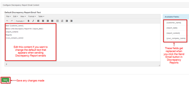 To edit the Default Content, type the text you want to appear when sending emails into the editor. You should always make sure that the {report_content} field is in the content as this gets replaced with the Consignment Errors that are part of the Discrepancy Report. To save your changes click the Save button at the bottom of the screen.
