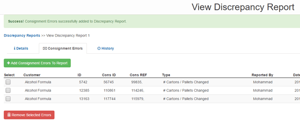 8. This will take you back to the Consignment Errors tab on the Discrepancy Report view screen where you will see the selected Consignment Errors appear in the list.