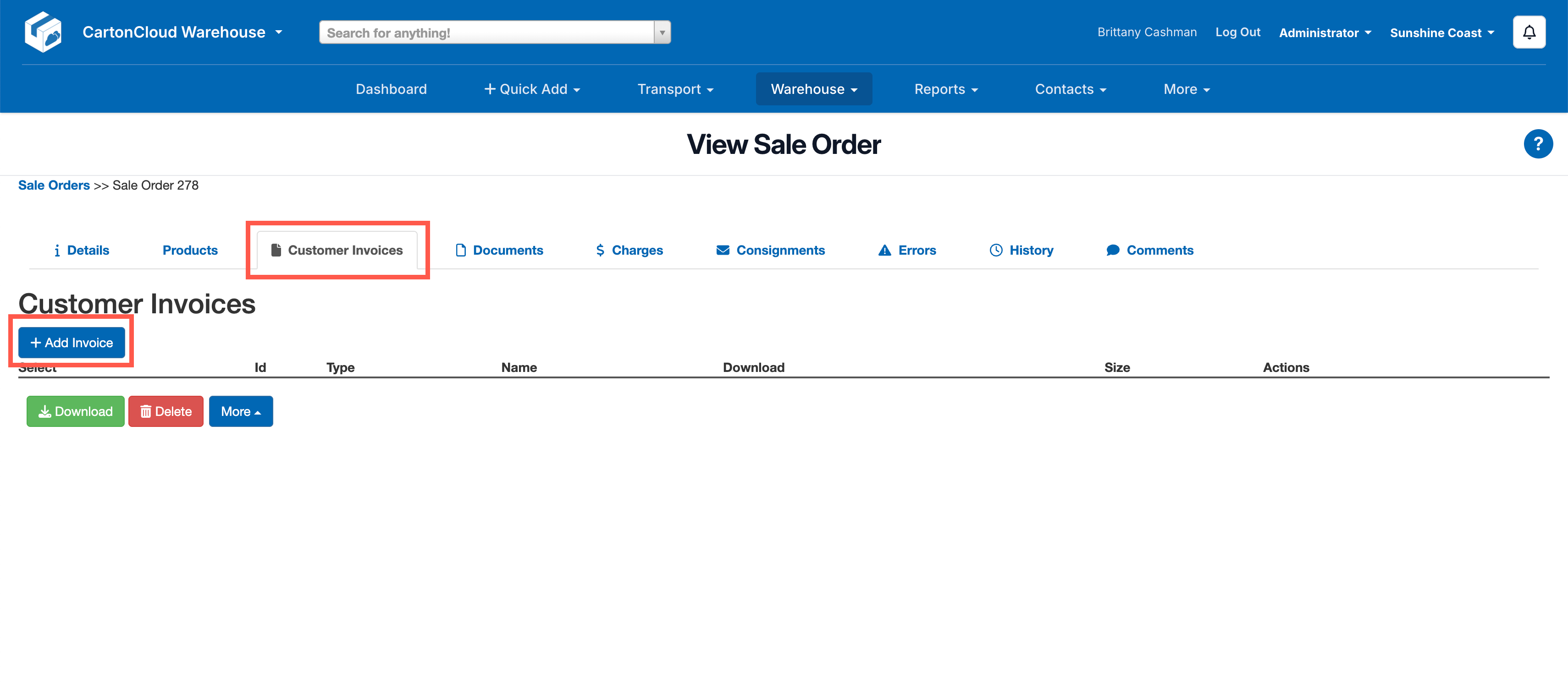 When a Sale Order is created in CartonCloud an option is provided for the corresponding Customer Invoice to be attached to the order.