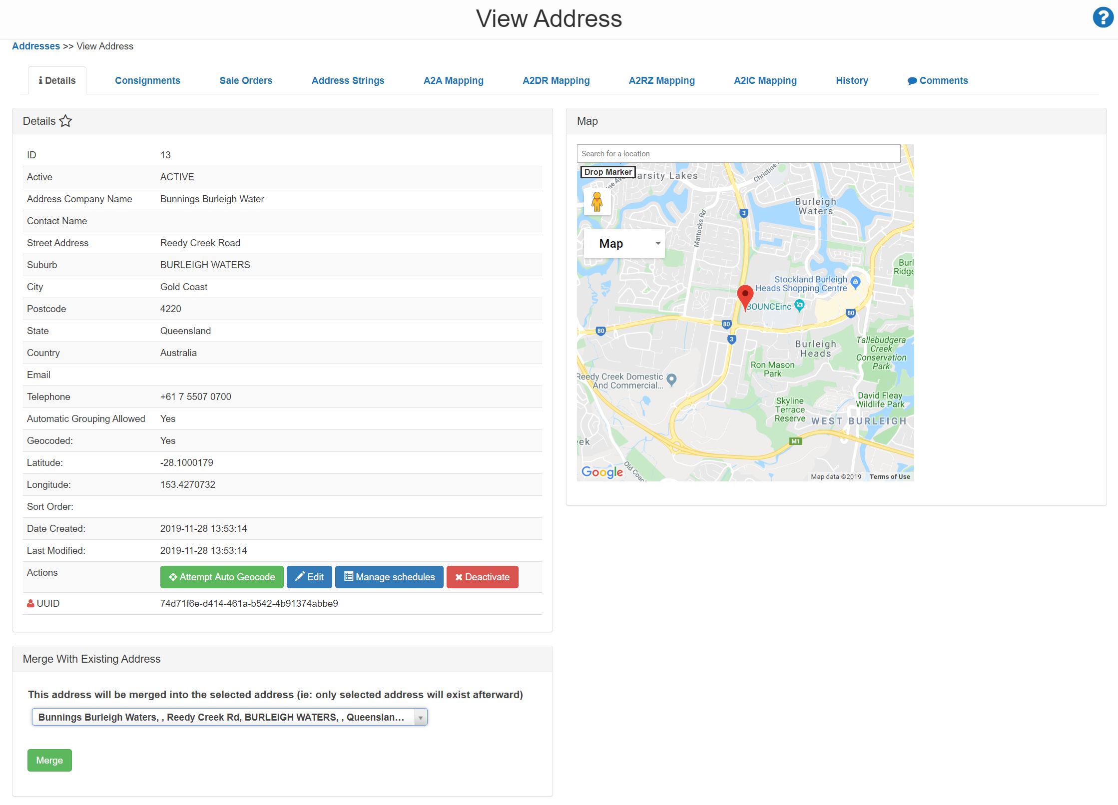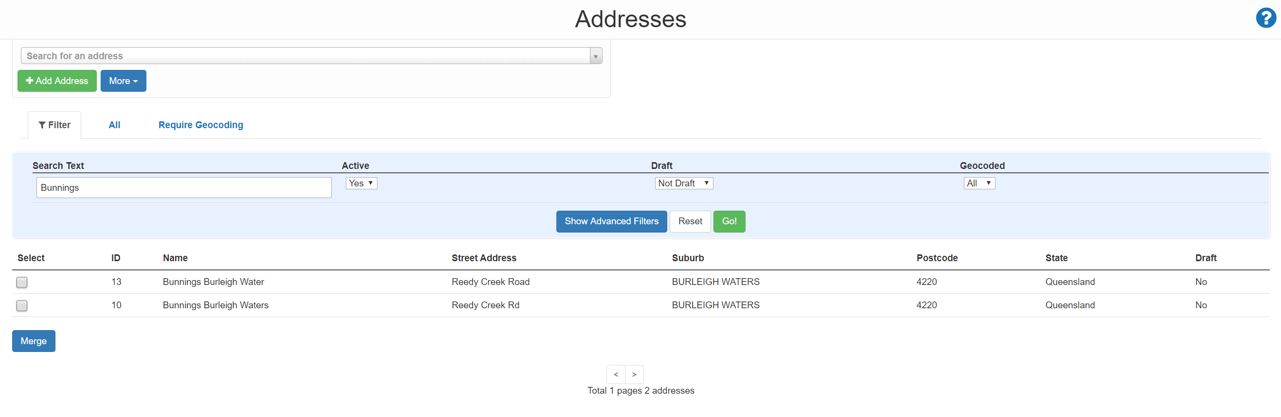 As an example, we will merge the Bunning's address below with ID 13 into the earlier created address with ID 10.