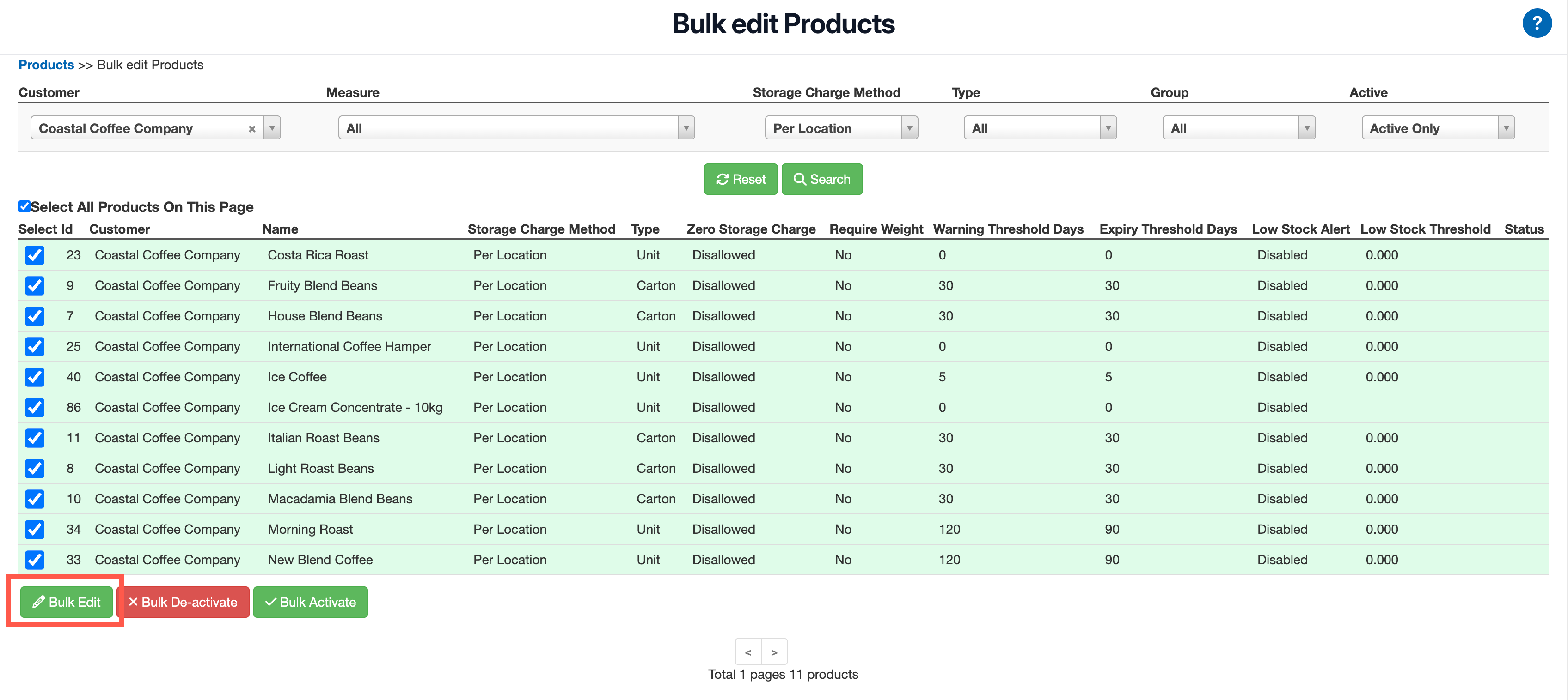 There may be times when you need to update Product properties in bulk. This feature will allow you to update the following fields against a product in bulk,