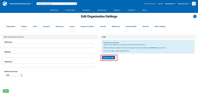 Now, let’s start setting up your Organisation Settings! We will continue to use Nick from Coffee Warehousing and Distribution as our example. This is his first day setting up CartonCloud, so where should he start? To begin, Nick needs to update his company logo, name and address.