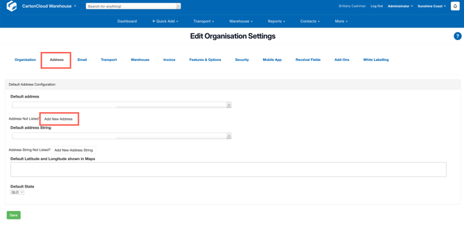Now, it is time to add your Organisation’s address to CartonCloud, from within the Organisation Settings: