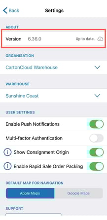 To check which version you're running, open the CartonCloud App and then open the Menu on the left and select "Settings". You will find the version information in the "About" section.