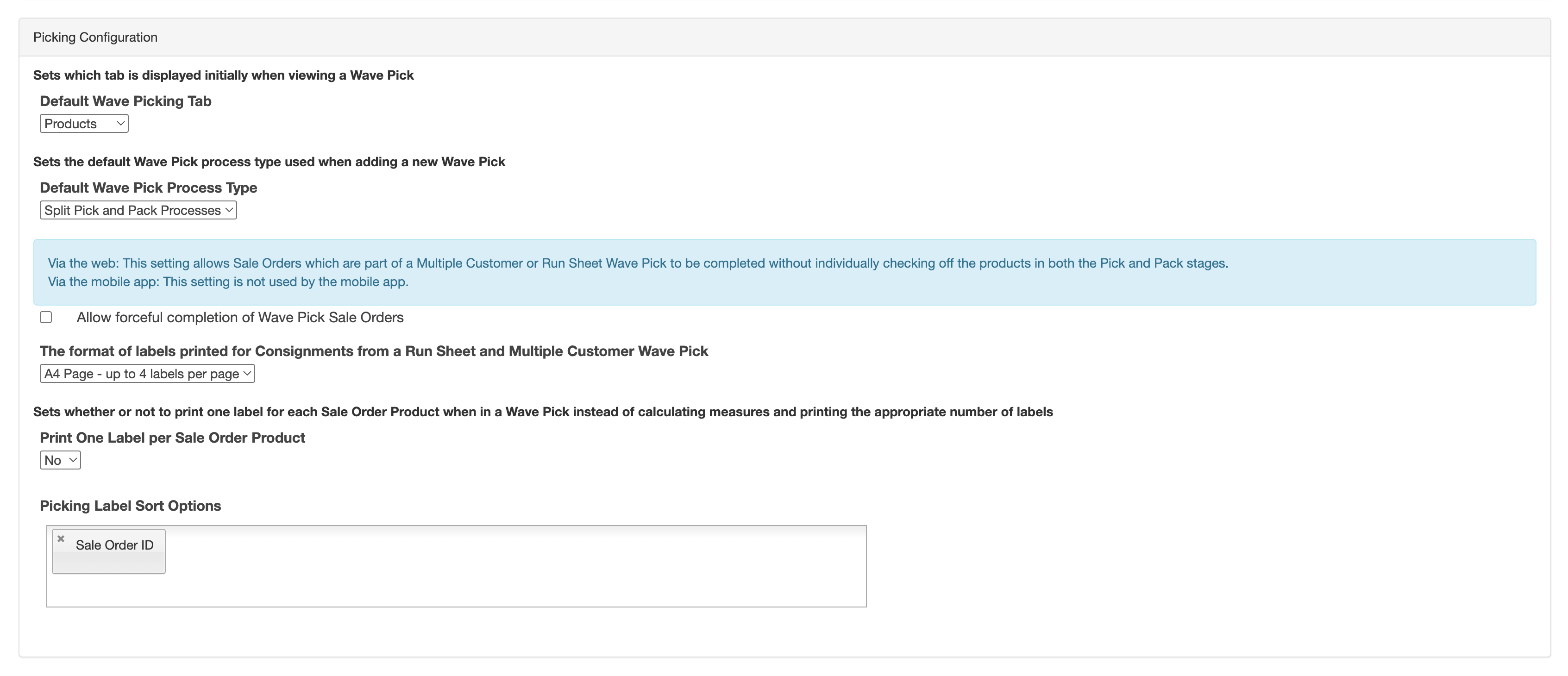 Sale Order Picking Labels that are printed from Wave Picks can be sorted using the "Picking Label Sort Options" setting located in Organisation Settings → Features & Options → Picking Configuration.