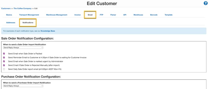 - Navigate back to the Customer settings within the Email tab and click the Notifications tab. Nick will need to select ‘Send Email when Sale Order is packed’ and ‘Send Reply Always’ from the drop-down menu under ‘When to send a Sale Order Import Notification’.