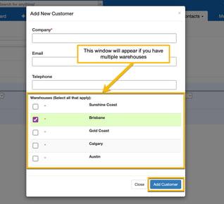 - If you have multiple warehouses set up, select the warehouse you wish this Customer to have access to. If you are storing goods for your Customer over multiple warehouses, ensure you select all applicable warehouses.