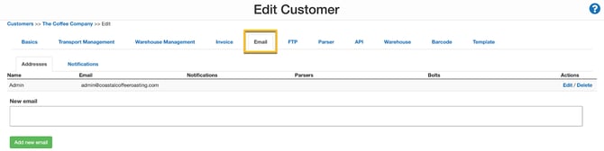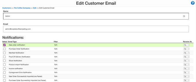 For Nick at Coffee Warehousing and Distribution, his customer Country Roasters have requested their admin staff receive emails when a new Sale Order is entered and when the order has been packed. In addition, they would also like their purchasing team to receive an email when their stock quantity reaches a certain level. Nick knows he can set all of these notifications up for the customer and does so from the Customer Settings. Follow the below steps to see how Nick can set up different notifications for different event milestones and to be sent to different email addresses for his customer.