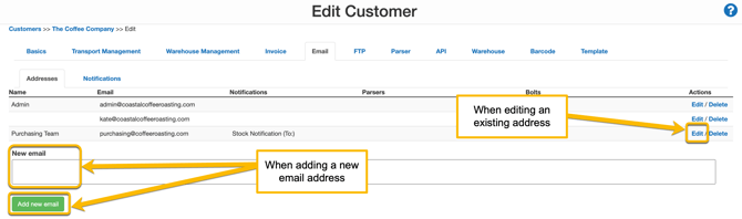 - If you already have an email address against the customer, you can click Edit against the address to enable the notifications.