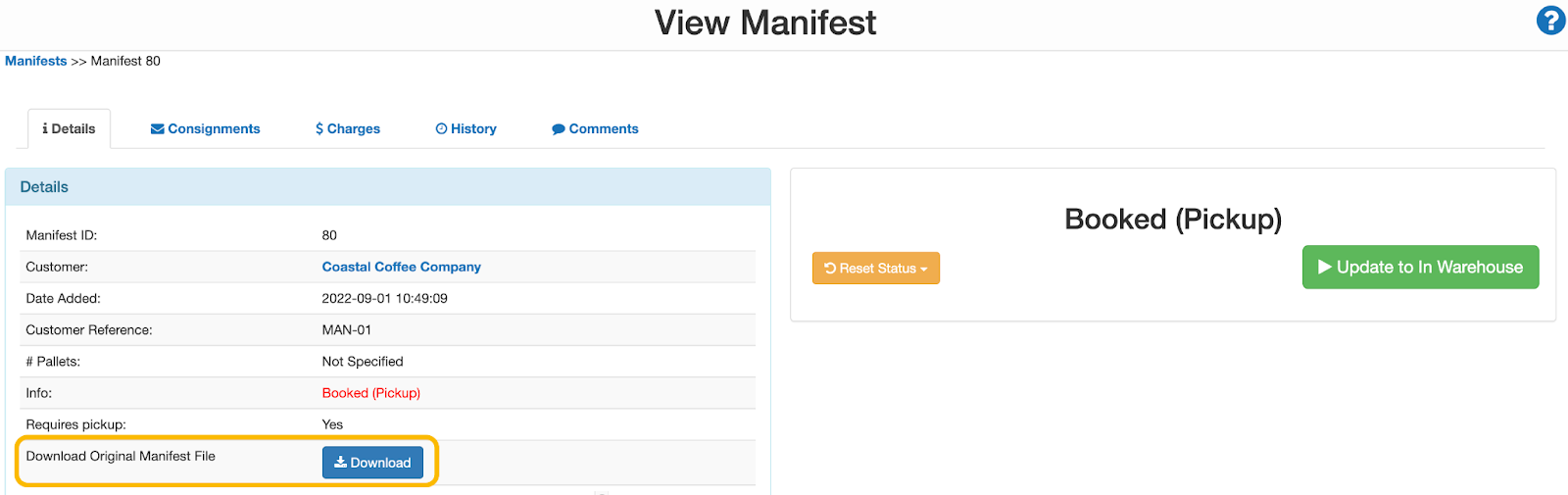 In this example, the Customer has sent through a Manifest of all Consignments that need to go out for delivery. The Consignments are already at the warehouse and do not need to be collected (for example, they have come from a Sale Order).