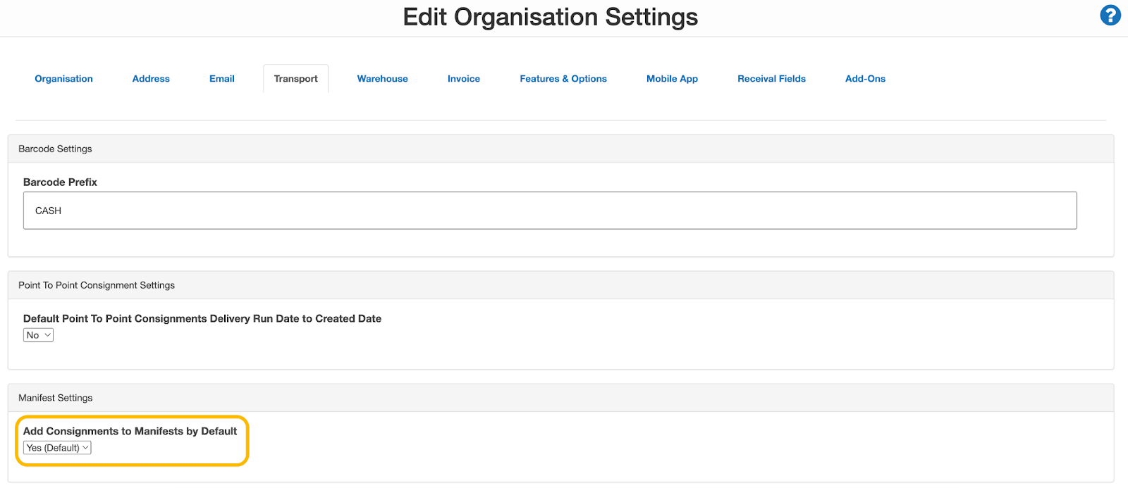 - Within the Manifest Settings box, select if you wish to Add Consignments to Manifests by Default by selecting Yes (Default) or No.