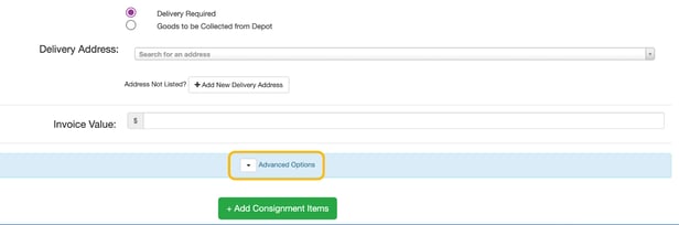- When creating a new Consignment, fill in the applicable information and then select the drop-down arrow next to Advanced Options (at the bottom of the screen).