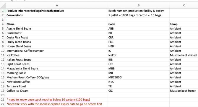 For example, Nick has received a list of products from his customer Country Roasters. Nick will need to add these products into CartonCloud so that when his customer sends through new orders, the information about the product is already there in CartonCloud.
