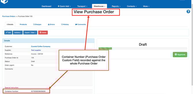3. A Purchase Order Custom Field for Container Number. This data is recorded against each individual Purchase Order.