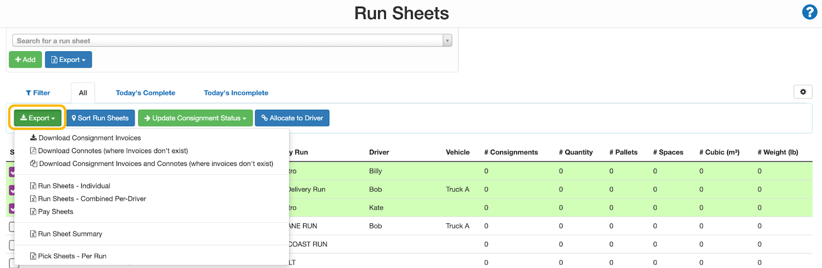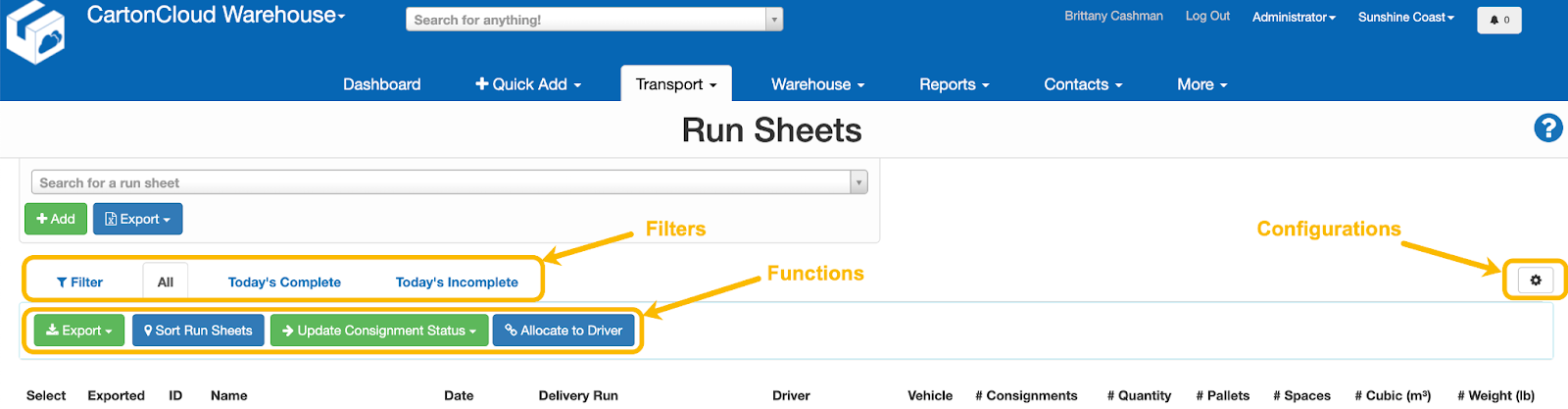Once on the Run Sheets page, Transport>Run Sheets, there are a number of different functions you can action.
