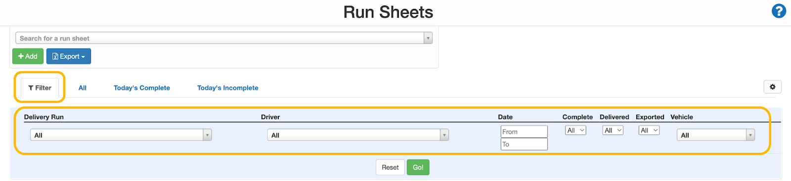 By using the filters on the Run Sheets page, you can easily manage your Run Sheets and filter the page to only see a selection of Run Sheets that you wish to see. When you click Filter, there are several options for filtering the Run Sheets page, including Delivery Run, Driver, Date, Complete, Delivered, Exported and Vehicle.