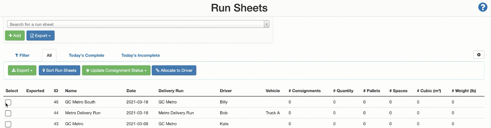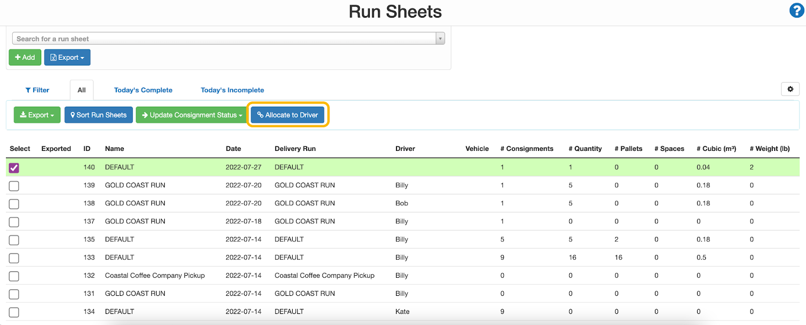 - Select the Run Sheet/s you wish to allocate a driver to.