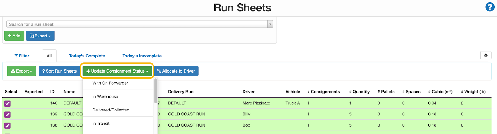 Using the Update Consignment Status button allows you to update the status of all the Consignments on a given Run Sheet. This is useful as it will enable you to update the status of Consignments in bulk.