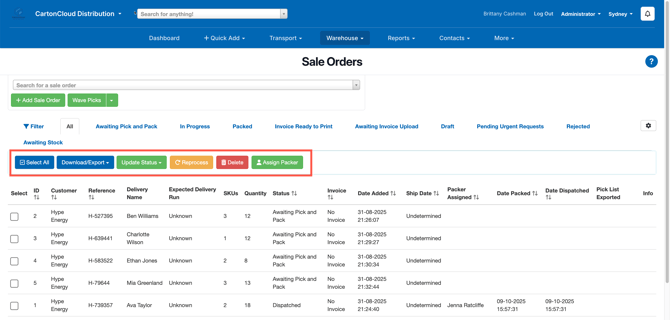 In addition, you can use the action buttons at the top to perform tasks on individual orders or in bulk. To do so in bulk, select the tick box beside the orders you wish to perform the action on or click Select All.
