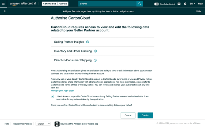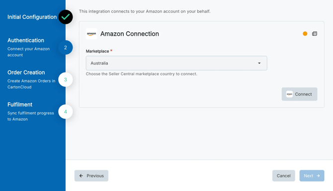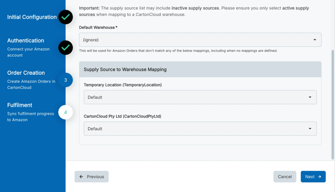 - The authorisation process requires connecting the integration to a specific marketplace (e.g., Australia). However, order routing does not filter by the authorised marketplace. Instead, Supply Source Mapping is used to ensure that only the correct orders flow through to CartonCloud.