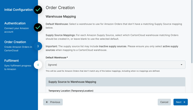 - Default Warehouse: Select a CartonCloud warehouse to use for Amazon orders that doesn't have a matching Supply Source to Warehouse Mapping.