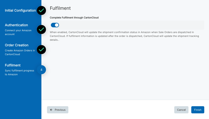 - Fulfilment is enabled by default, but you can disable it if you do not want CartonCloud to send shipment confirmations and tracking information back to Amazon.