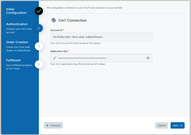 - Enter the Account ID and the Application Key from Cin7 Core. These can be created on the API setup page inside the Cin7 Core application: https://inventory.dearsystems.com/ExternalAPI.