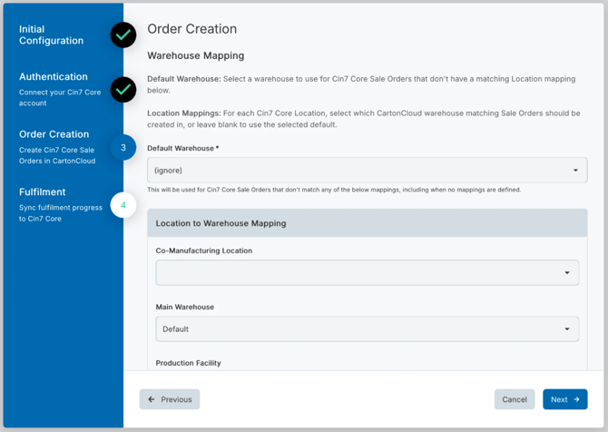 - Here you will need to map which Cin7 Core orders will go to which CartonCloud warehouse.