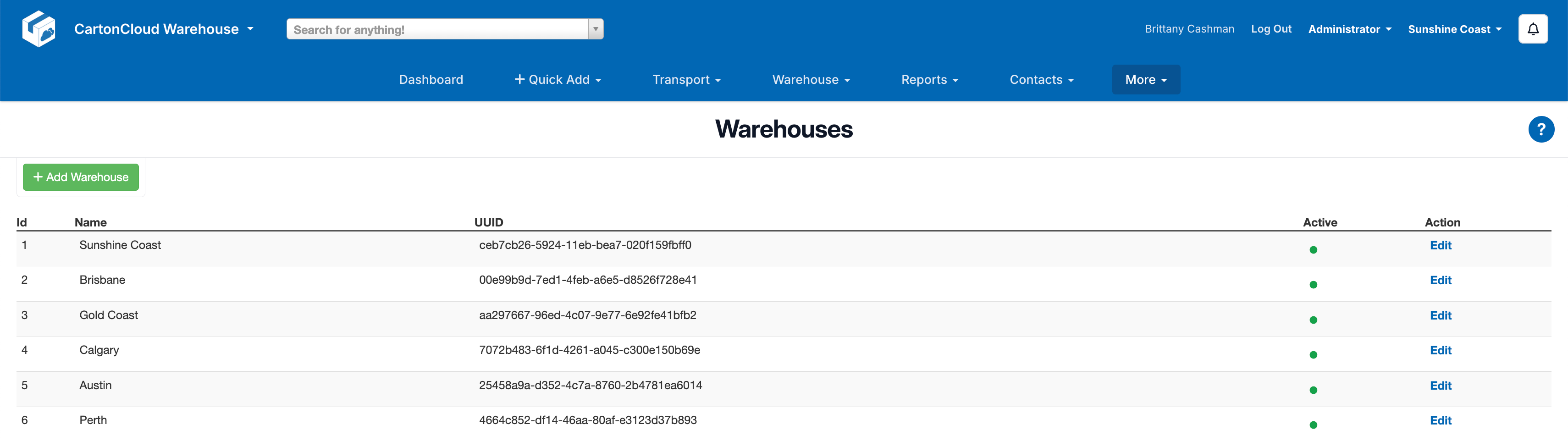• Once saved, you will be able to see all your Warehouses listed.