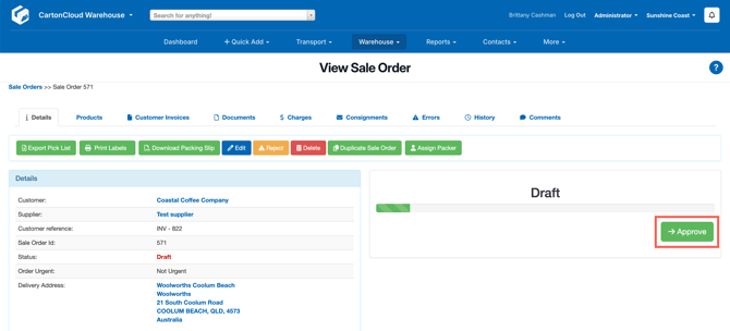 - Approve the order by clicking Approve.